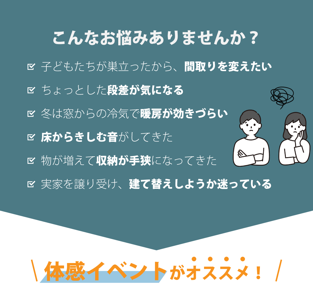 リノベーション体感イベント~リノベ?建替え?どっちがいいの?~ 開催日時 <好評につき延長しました> 10月12日13日14日、19日20日、26日27日 ※大好評につき、13日は満席になりました。 予約はこちらから このイベントの予約期間は終了しています