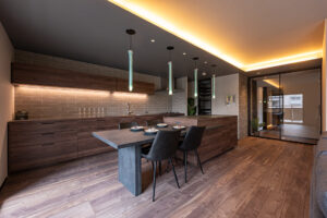 ダイニングの壁上部からふわっと光が広がる設計にすると、夜中でもまぶしさを感じず、家族の時間をやさしく包んでくれます。
