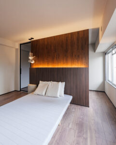 ベッドヘッドの背面に間接照明を設置すると、ホテルのような静けさと高級感を演出できます。